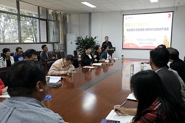 活动中,支部书记宗先顺给在场党员上了一堂生动的爱国主义党史教育课,系统全面地梳理了中国共产党98年的光辉奋斗历程,强调新时代共产党员要认真学习党史、国史,知史爱党、知史爱国,要了解我们党和国家事业的来龙去脉,以史为鉴,提高处理实际问题能力、树立爱国主义思想。在随后的讨论中,与会党员结合习近平总书记在庆祝中华人民共和国成立70周年大会上的重要讲话精神,畅谈在新时代如何引导学生增强“四个自信”,如何厚植爱国主义情怀,把爱国情、强国志、报国行融入到学习和工作中的体会,现场气氛热烈。
