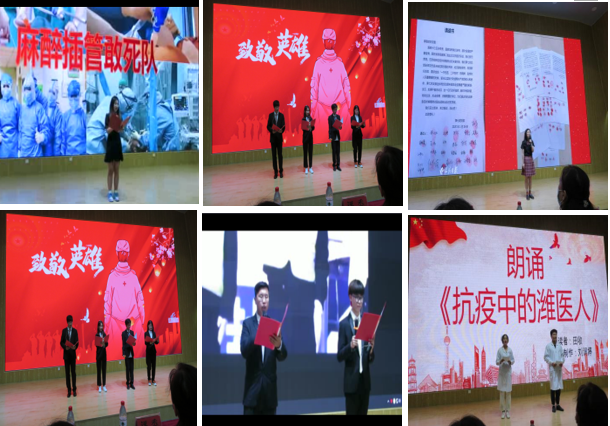 一首《归来》让我们为疫情中医护人员的的无畏与大爱所震憾:“国家的意志,白衣战士的情怀,全社会的支持,所有人对生命的热爱,像三山五岳巍峨,像江河大海澎湃!没有这样的力量整合,就不会有我的胜利归来!”“若我,归不来,也如归来一样,倒下的是躯体,站立的是永爱!”《战疫中的潍医人》深情演绎了潍坊医学院附属医院季宏志医生强忍母亲去世的悲痛,圆满完成援鄂救助任务的故事:“那个晚上,我一个人躲在房间里嚎啕大哭,你知道那种无法排解的痛苦是多么撕心裂肺,多么痛彻心扉!”“可是我决定隐瞒这个消息,第二天一早,我继续奔赴我的战场。”《我看见》让我们看见了疫情的凶猛,看见了中国共产党的初心和使命,看见了不可阻挡的中国力量。《步履不停》展示了我校医学生的使命感:“作为医学生,我更加感受到了这份使命感,秉承‘乐道、济世’的校训,弘扬‘自强不息、锐意进取’的潍医精神,积极参与到疫情防控工作当中。”《幸而有你 山河无恙》我们深深体会:“我不曾知晓你的名字,但我知道你的样子。你的样子,就是中国最美的样子。”“幸而有你们,中国平安;幸而有你们,山河,无恙!”一个个动人的故事,一句句感人肺腑的话语,深深地感染着在场观众。