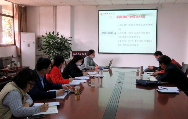 伦理学教研室主任徐玉梅教授进行了学情分析,围绕“达成三个目标”“探索课程思政模式”“推进线上线下混合式教学”“强化医学人文实践教学”的教学指导思想,对教学内容要贯彻执业医考试大纲、线上线下教学过程实施、具体实践教学、探索无纸化考试等作出了统一的规划和安排。尤其提出,两门课程教学要有课程建设意识,整体推进山东省线上线下混合式一流本科课程、山东省普通本科教育课程思政示范课程建设;要坚持教学与研究相结合,以山东省本科教学改革研究重点项目“临床岗位人文胜任力导向的医学人文实践教学模式构建研究“的有效开展,探索创新课程实践教学的新形式,切实提高课程教学的实效性。