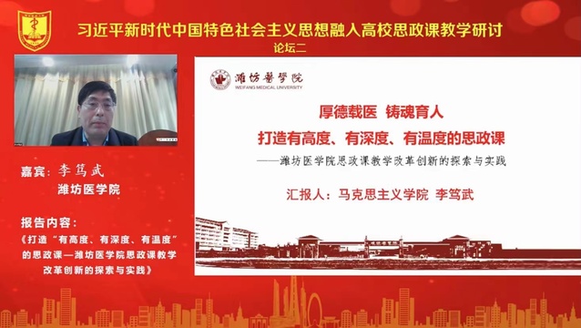 院长李笃武作了《打造“有高度、有深度、有温度”的思政课—潍坊医学院思政课教学改革创新的探索与实践》的主题报告,围绕如何打造“有高度、有深度、有温度”的思政课,结合学院近年来的思政育人实践,分享了我校思政课教育教学的改革初衷、创新理念、特色做法等,内容丰富、深入浅出,引发了大会的高度关注。