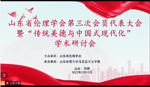 2月12日,山东省伦理学会第三次会员代表大会暨“传统美德与中国式现代化”学术研讨会在济南召开,会议于线上线下同步进行。会议回顾总结了学会第二届理事会的工作,选举产生了第三届学会理事会。御书屋 徐玉梅教授当选为学会常务理事,于芳副教授、刘翠、刁传秀老师当选为理事。