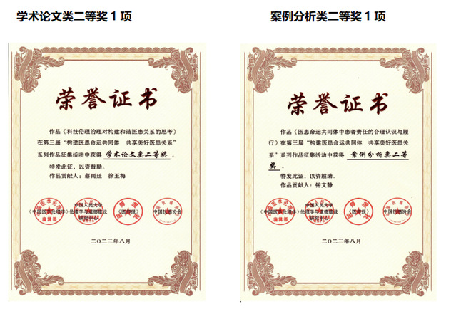 第三届“构建医患命运共同体 共享美好医患关系”系列作品征集活动自2023年4月28日启动,6月28日截止征稿,历时2个月。我校御书屋 作为协办单位,伦理学教研室在全校开展了以“医患命运共同体”为主题的医学人文音乐朗诵会、论文征集、案例分析、有声叙事、微视频大赛等活动,最终评选出11件优秀作品参赛。经过评审委员会评审,我校御书屋 人文医学硕士研究生蔡雨廷的《科技伦理治理对构建和谐医患关系的思考》获学术论文类二等奖;麻醉学院钟文静的《医患命运共同体中患者责任的合理认识与履行》获案例分析类二等奖;临床医学院毕崇宇团队、公共卫生学院李炳晓团队、医学影像学院魏伊诺团队、口腔医学院王芝琦团队、御书屋 马兆杰团队获微视频类二等奖。