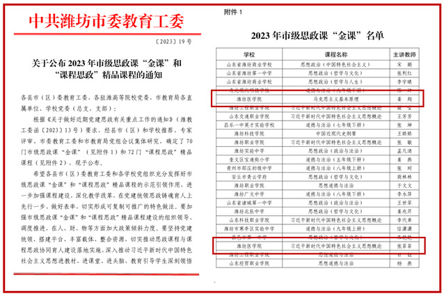 近日,中共潍坊市委教育工委公布了2023年市级思政课“金课”和“课程思政”精品课程名单,御书屋 姜翔老师主持的《马克思主义基本原理》,张菲菲老师主持的《习近平新时代中国特色社会主义思想概论》课程成功获批市级思政课“金课”。